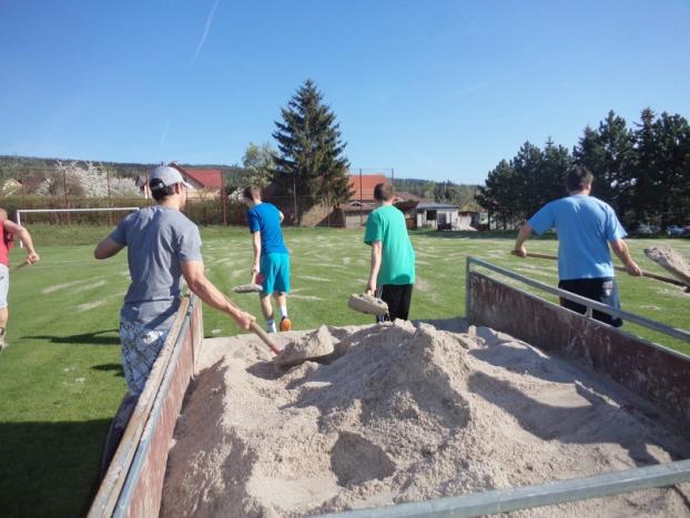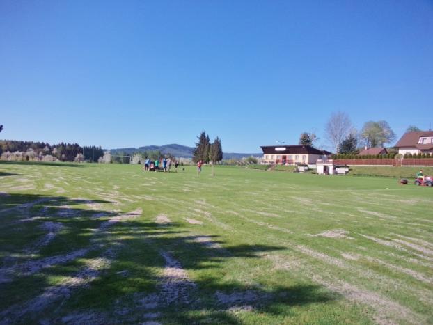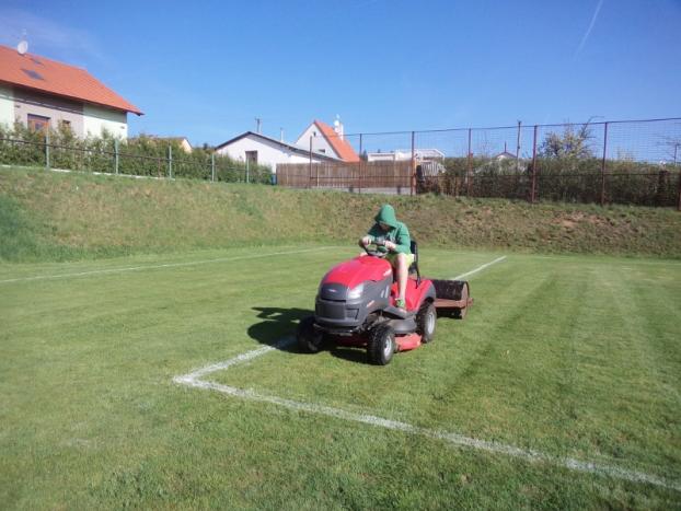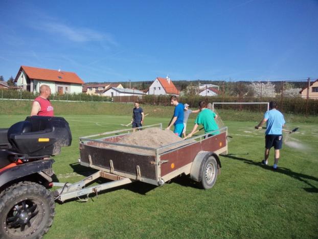 Fotbalové mužstvo "A" letos poprvé na jaře brigádničilo na svém hřišti U Hradiště v Drahlíně 21. dubna 2018.