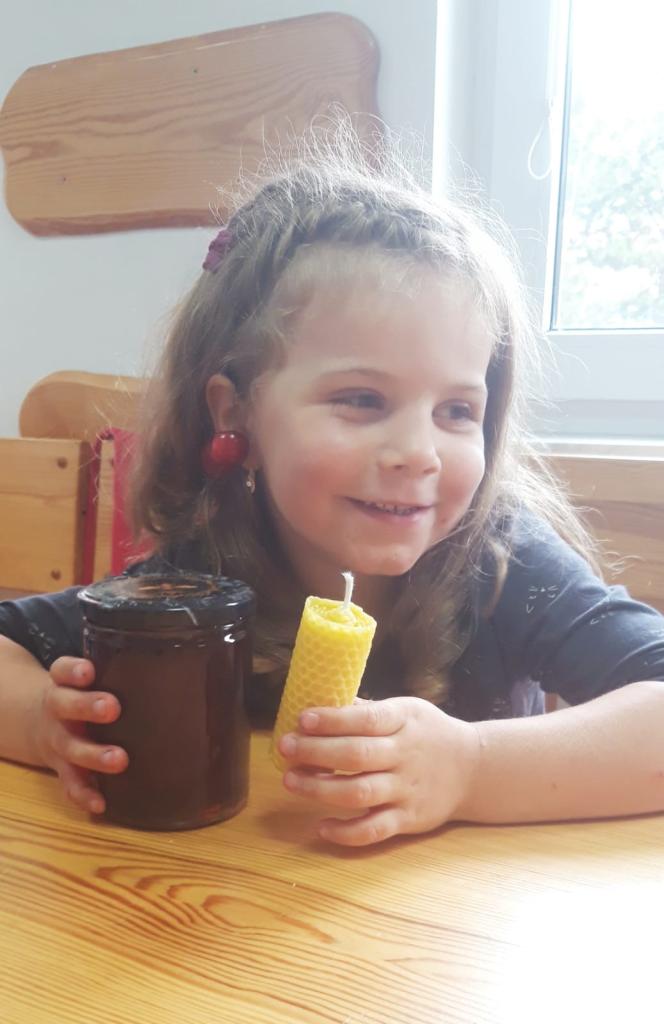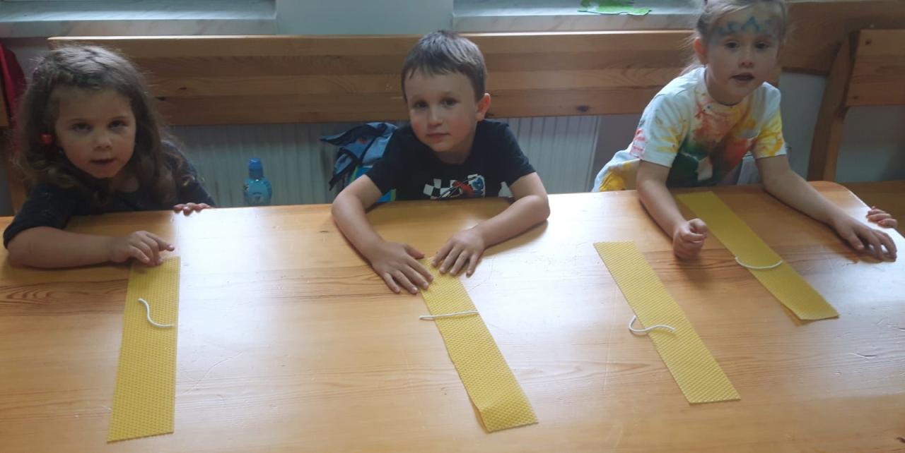 Dále děkujeme manželům Polákovým - včelařům, kteří nás krásnou formou poučili o životě včel, nechali nás ochutnat med z plástve, donesli vosk a knot na svíčky a každému donesli sklenici medu! Krásné a nečekané gesto, které posunulo tábor ještě výš, než bylo v plánu!